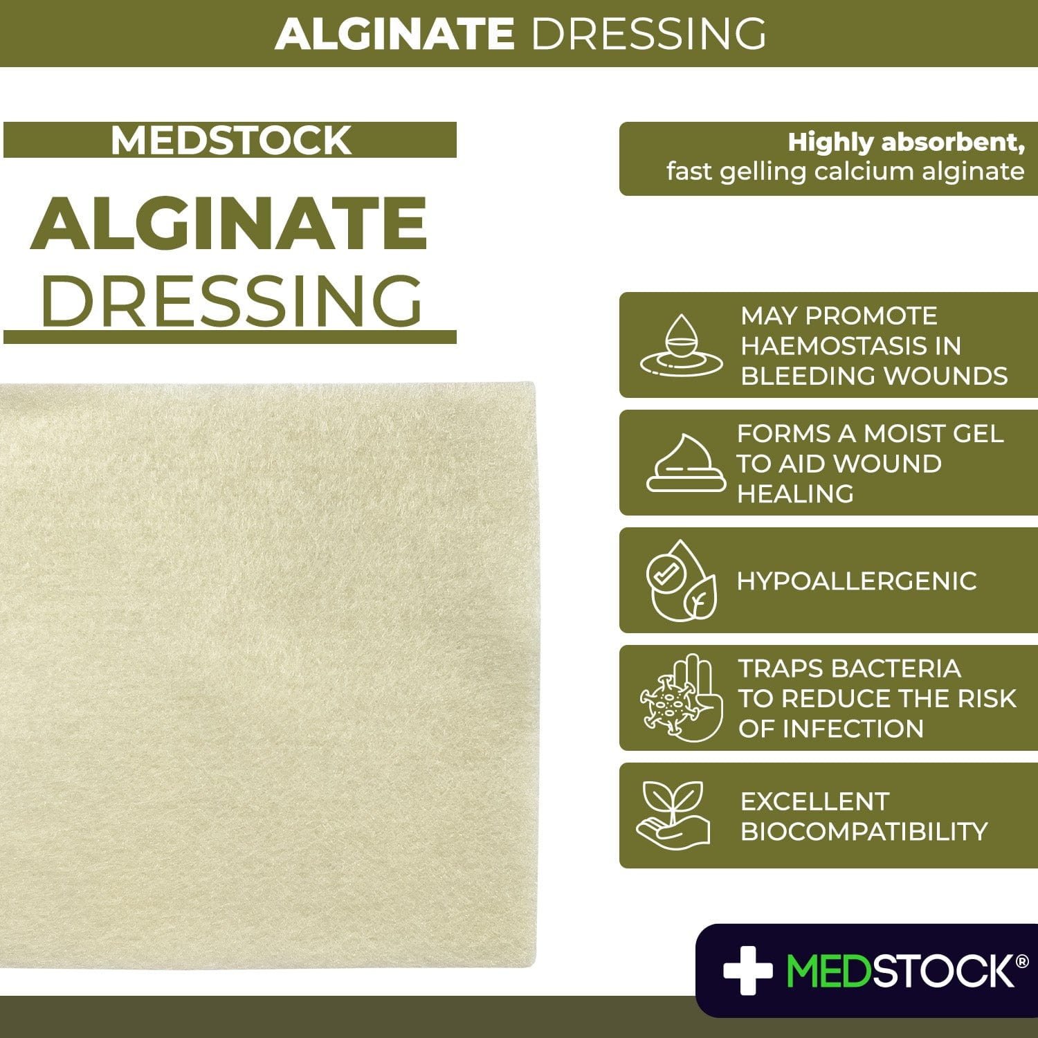 Medstock Alginate Dressing is a naturally derived, non-woven dressing made of 100% calcium alginate fibres that effectively absorbs exudate and provides a moist healing environment.
